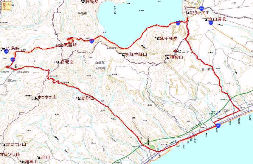 苫小牧から樽前山の肩を抜けて支笏湖岸を抜け、美笛峠を経て大滝村、三階滝から白老の森野へ抜ける周回ルートです。樽前の肩は峠ではありませんが合計三つの最高点を含む約100kmのコースです。